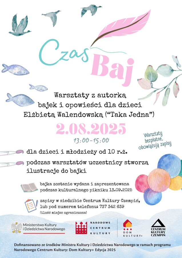 W ramach jednej z inicjatyw lokalnych programu Dom Kultury+, powstał projekt autorstwa Pawła Salacha pt. Czas Baj. Efektem końcowym inicjatywy będzie Bajka, napisana i zilustrowana przez dzieci pod okiem pisarki Elżbiety Walendowskiej (Taka Jedna). Zapraszamy na warsztaty, podczas których powstanie bajka, następnie na kolejnym osobnym warsztacie zostaną stworzone ilustracje do niej. Szczegóły na plakatach, ilość miejsc ograniczona.